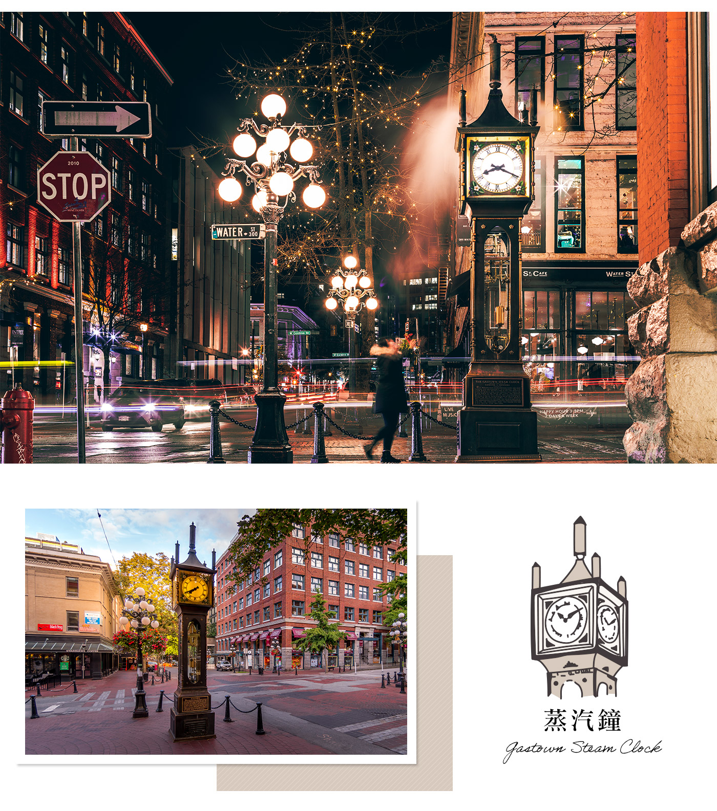 溫哥華的發源地:煤氣鎮(Gastown又稱蓋士鎮)。是溫哥華最早開發的社區這座全世界第一座的蒸氣鐘,高2公尺左右,四面有鐘面,鐘盤以下完全透明,可以清晰看見鐘內零件的運作。每十五分鐘就會從汽笛噴出白煙(蒸氣),而且還會發出旋律報時。來到煤氣鎮最不能錯過這全世界第一座目前仍在運行中的蒸汽鐘。