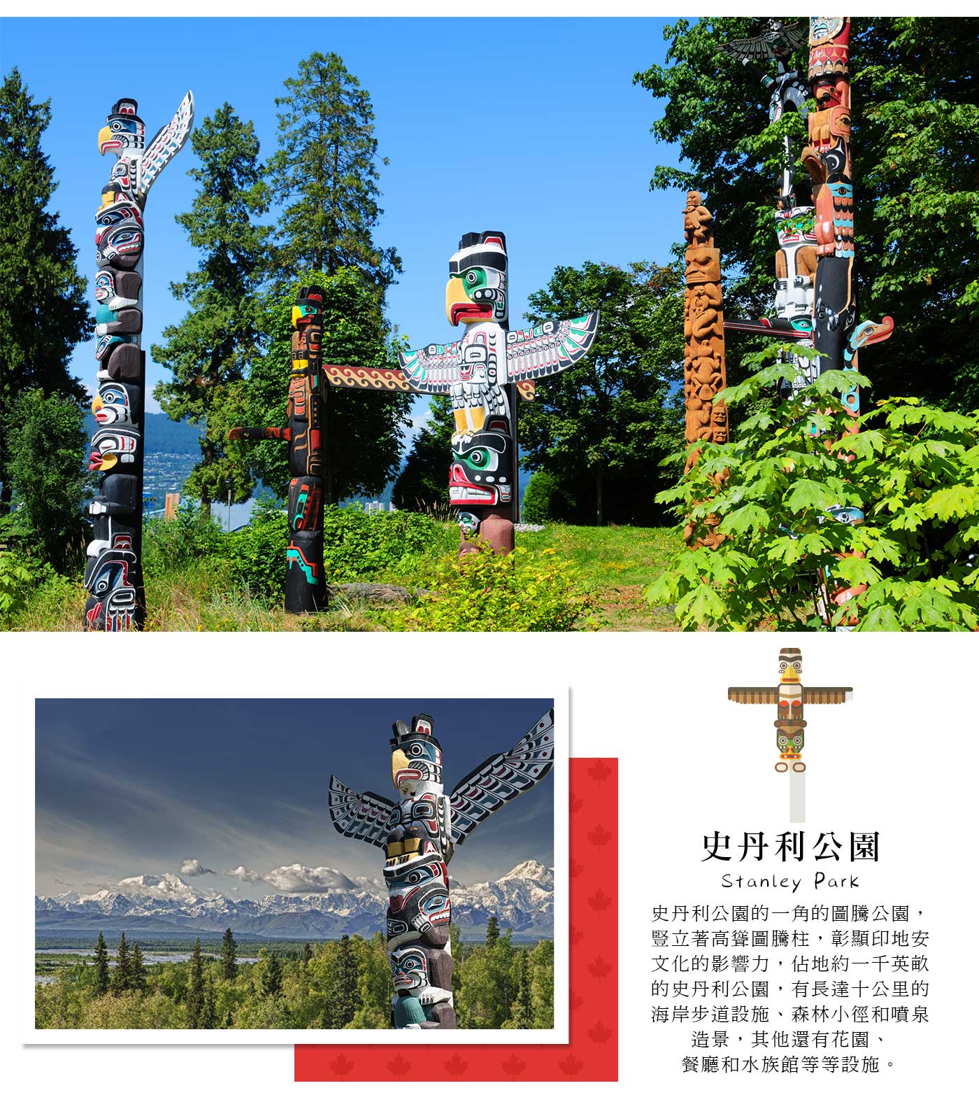 史丹利公園的一角的圖騰公園,豎立著高聳圖騰柱,彰顯印地安文化的影響力,佔地約一千英畝的史丹利公園,有長達十公里的海岸步道設施、森林小徑和噴泉造景,其他還有花園、餐廳和水族館等等設施。來到史丹利公園,5月可以欣賞石楠,6月以後則是玫瑰,不過,最壯觀的還是加拿大西岸的松樹植物林,特別是一顆樹齡近千年的神木。