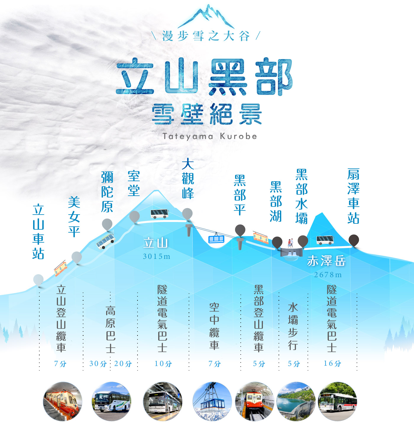 ※貼心小叮嚀:由於黑部立山位於海拔2500多公尺的高山,山上溫度大都很低,敬請上山旅客要穿著保暖衣物,建議穿著防水防滑功能之鞋子、手套、保暖帽子、圍巾、太陽眼鏡。