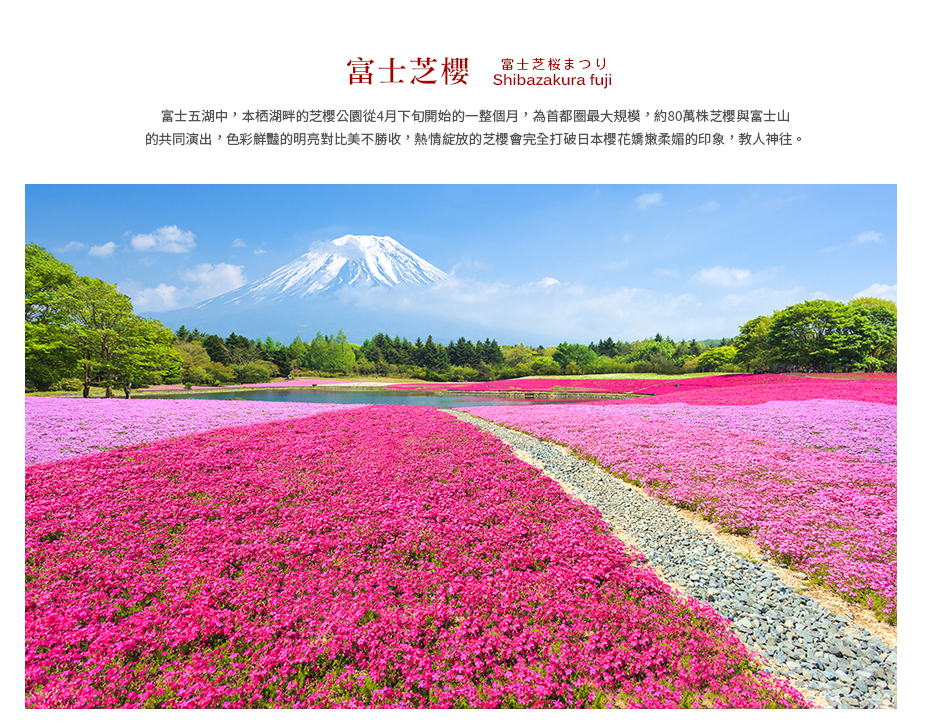 富士五湖中,本栖湖畔的芝櫻公園從4月下旬開始的一整個月,為首都圈最大規模,約80萬株芝櫻與富士山的共同演出,色彩鮮豔的明亮對比美不勝收,熱情綻放的芝櫻會完全打破日本櫻花嬌嫩柔媚的印象,教人神往。