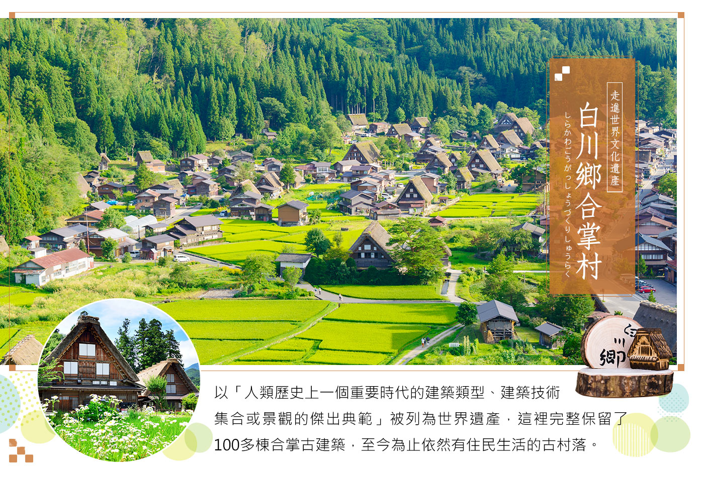 地處豪雪地帶,再加上山區地形阻絕,形成了地域獨特的風俗文化,至今仍完整保留為日常生活之用,而其中以合掌型的茅草家屋最為著名。為防積雪而建構的急斜面的茅草屋頂,有如祈禱時雙手合十的形狀,日文稱為合掌,而這種建築風格被稱為合掌造。目前尚有113棟,屋旁田地園圃交錯銜接,構成一幅濃厚懷古幽情、山間農村的田園景觀,於1995年12月聯合國文教組織登錄為世界遺產以來,世界各國的觀光客蜂擁而至。