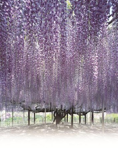 紫藤是日本的古老花木,在日本的詩歌集《萬葉集》當中也受到相當崇高的歌頌。具有日本代表性的原種野田藤,根據花的顏色依次綻放,花期可以長達一個月左右。佔地六百平方公尺的三大面大紫藤棚和在全球中很稀有的八重大藤棚。在庭園配置的紫藤、綿延長達80公尺長的紫藤花隧道(白藤與黃花藤)和屏幕式藤棚,通過"水鏡"的效果,倒映在水池中的晚間紫藤,美麗得令人窒息,彷彿到夢幻般的迷幻世界。