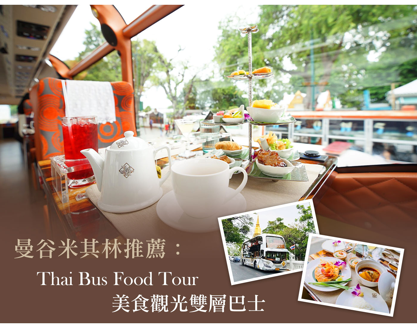 巴士結合了美食、美景,把新的旅遊概念帶到另一個層次,車上有免費無線網絡,充電器,桌面平板,復古的盥洗室。重要的是車上的美食由獲獎無數的ThipSamai餐廳提供(皇室御用餐廳、2018年米其林BibGourmand、泰國美食指南ShellChuanChim、CNN、寂寞星球、BBC都報導過)。全程2小時在大曼谷市穿越10個重要景點,途經華南蓬,Traimit寺,耀華力路,PhukhaoThong山,Prasat,民主紀念碑,大皇宮,黎明寺,Pho寺和巨型鞦韆,跟我們來場時尚絢爛的巴士之旅吧。