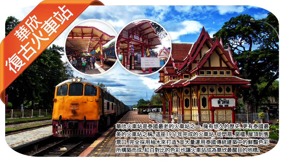 有泰國最美的火車站之稱,也是泰國最老的火車站之一,這座1911年完成的火車站,從門扇、窗櫺、屋頂到售票口,完全採用柚木來打造,並大量運用泰國傳統建築中的鮮豔色彩所構築而成,紅白對比的色彩也讓火車站成為華欣最醒目的地標。在華欣火車站,可看到形形色色的乘客,為這個百年車站延續其風華故事,交織出一幅多姿多采的畫面。