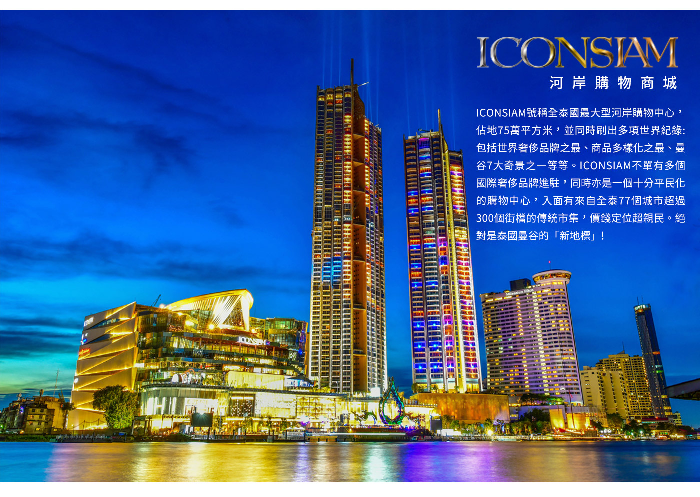 泰國曼谷湄南河畔上的巨型超級商城ICONSIAM暹邏天地,是斥資超過540億泰銖的豪華級百貨,也是泰國第一間擁有室內水上市場的百貨公司。不僅有各大知名品牌、還有許多泰國美食,最棒的是在百貨公司能吃到水上市場的平價小吃,與日本高島屋結合,提供許多美妝與生活用品,此間百貨是全曼谷最高的70層建築,擁有東南亞最長噴泉、河濱公園長廊、國家級文物博物館、各項娛樂設施,等著您來探索。