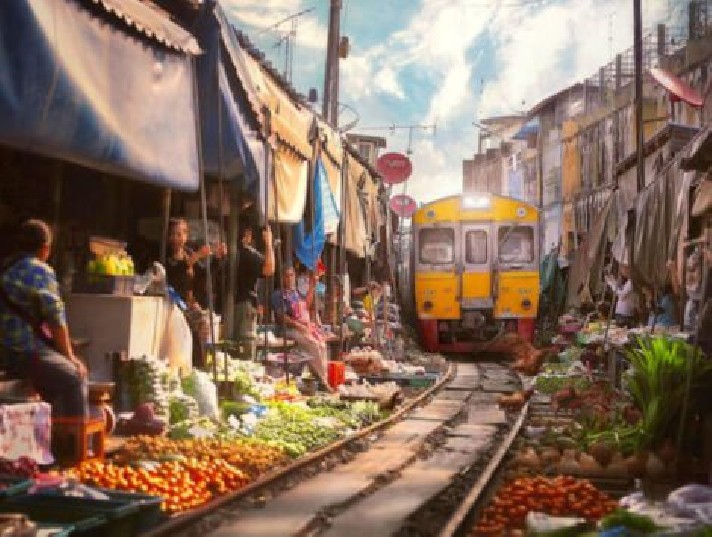 起始於火車站的美功鐵道市集全長約數百公尺,各種小攤就沿著鐵軌隨意設攤,這就是網路上流傳的【超爆笑鐵路菜市場】。每當火車通過時的鐘聲響起,攤商不疾不徐的將原本擺在鐵軌上的蔬果、生魚、鮮肉收起來,看著火車底盤開過生鮮商品後,市場又回到沒有火車前般的營業,這時左看看右看看!噗茲笑出來就對啦,可謂是世界奇觀呢。