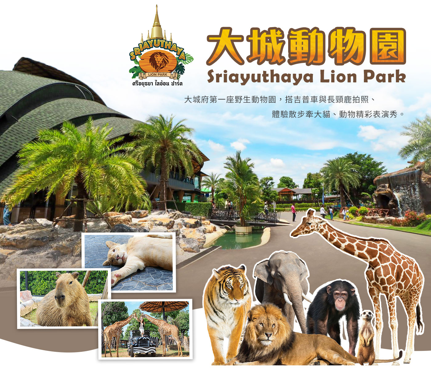 位於大城府2021年底最新開幕動物園SriayuthayaLionPark為大城府第一座野生動物園,從曼谷出發約1.5小時車程。此園區環境乾淨寬敞,整體設計新穎,在園區散步令人心曠神怡。園內動物種類繁多,不只可以近距離接觸各種野生動物,還推出了搭乘吉普車與長頸鹿拍照的活動,另外更有牽大貓散步拍照的體驗。除了上述活動外,大城獅子動物園還有大象、猴子等精彩表演秀,還能搭乘馬車、騎迷你馬、踩天鵝船遊湖,非常適合全家一起共遊。