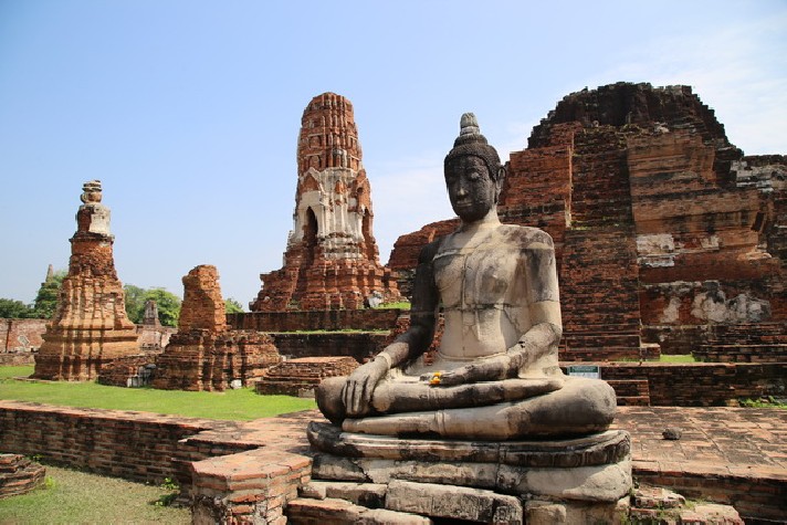 瑪哈泰寺建於西元1374年,大城王朝最輝煌的時代,為皇家寺廟之一,建築特色主要以高棉式為主(高棉為吳哥窟古城),經歷百年的建築,抵不過歲月的摧殘,主塔曾經倒塌又修復,西元1767年,緬軍大肆侵略,並放火燃燒整座寺廟,在戰火的蔓延下,留下的盡是身首分離、手腳斷裂的佛像,而走進瑪哈泰寺中,不會感覺像是廢棄寺廟,而是一座氣勢磅礡的文化宮殿。因為一個『樹根盤佛頭』(樹中佛)而聞名於世,泰國七大奇觀之一,稱得上是大城必看景點之一。也因此所有的旅遊團都一定會帶到這個景點,它同時也是大城最古老的廟宇之一,興建於1374年。當然,最受遊客注意的還是樹中佛頭這個奇特的景象了。有個說法是緬甸軍大肆破壞大城文物的時候,佛像幾乎無一倖免,當一群緬甸軍人砍下這尊佛首時,落下的佛首竟立刻被樹根包圍保護起來,這一幕嚇得緬甸兵四散而逃。