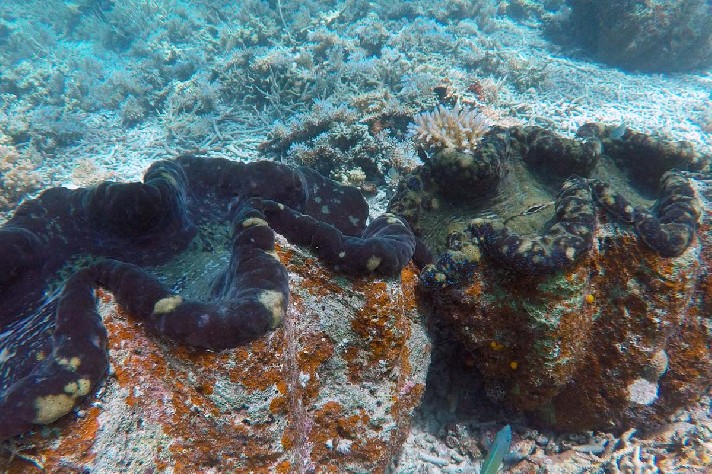 【大干貝城】:特別包含帛琉海底奇觀,數十顆的百年車磲貝聚集生長的大干貝城,每顆干貝均有1~2米的體型,據說干貝生長非常緩慢,一年只成長一公分左右,所以每顆干貝均有百年以上的年紀。