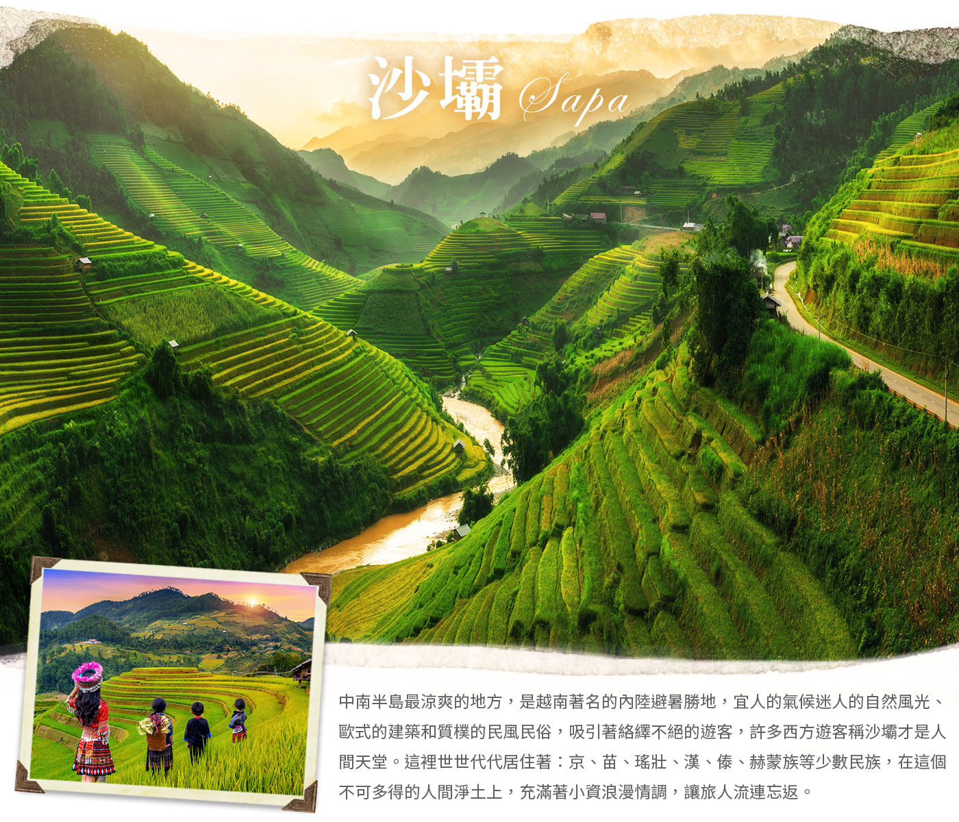 沙壩是中南半島最涼爽的地方,在法國殖民時期被打造為一個高山避暑度假勝地,因著夢幻的雲海繚繞和氣勢磅礡的梯田景色,是一處被世人稱為世外桃源的地方。獨一無二的景緻吸引著世界各地的遊人前往朝聖。宜人的氣候迷人的自然風光、歐式的建築和生活情調、質樸的民風民俗,吸引著絡繹不絕的遊客,許多西方遊客稱沙壩才是人間天堂。這里地勢高,氣候清涼,被譽為林中的寶石。鎮上樹木鬱鬱蔥蔥,棟棟別墅若隱若現,周圍層巒疊嶂,風景如畫,正是SaPa最特別的魅力所在。