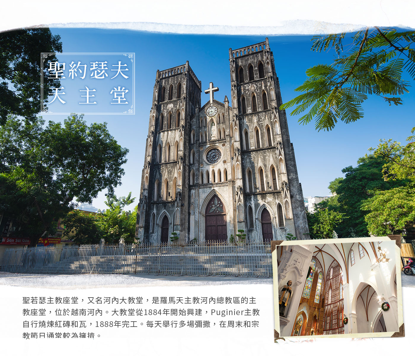 循著時代遺留下法式軌跡,走進懷舊的法國城區,聖約瑟夫大教堂、風格小洋樓,法式建築無處不在,梧桐樹沿著街道種植,綠意盎然,露天咖啡座,一律面外,這是法國人留下的殖民痕跡。教堂是典型的哥德式建築,是當時法國殖民存在的重要見證建築之一,它的建築遠看與法國巴黎聖母院有著幾分相似,規模雖比不上巴黎,但外表卻同樣散發著一種神聖不可侵犯的莊嚴。教堂內部有華麗的彩繪玻璃,還有描繪著天主教故事的畫作;而每當有天主教的慶典時,在教堂內外和外圍的廣場都會擠滿天主信徒,甚至世界不同地方的教友都會特地前來教堂一起進行彌撒,場面十分熱鬧。巴洛克風格歌劇院陽光下裝扮得更雍容華貴,該歌劇院據稱是歷史悠久的巴黎歌劇院的縮小版,新藝術風格建築旁,簡潔的法式庭園中設有露天咖啡座,空氣中越式滴濾咖啡的香味瀰漫,在深焙的慵懶香氣中,百年風華盡收眼底。