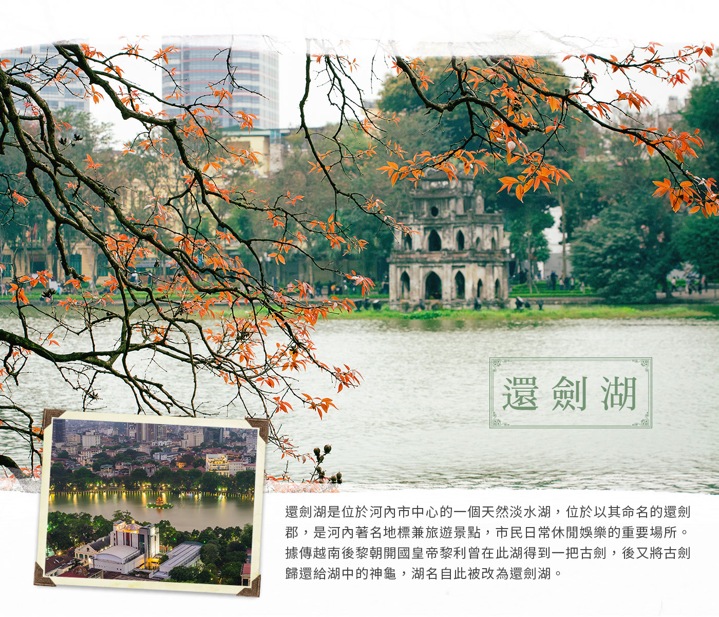 是一座有著千年歷史的古城,曾為越南李、陳、後黎諸封建王朝的京城,被譽為“千年文物之地。河內風光綺麗,具有亞熱帶城市的特色。由於樹木終年常青、鮮花四季盛開、市區內外湖泊星羅棋布,因此,河內又有“百花春城”的美稱。由於越南曾受法國殖民統治,故河內古城內保有許多法國建築,這座古城,集中了滄桑、現代而又低調的浪漫等不同元素,將法國殖民風情與越南傳統風格融為一體。