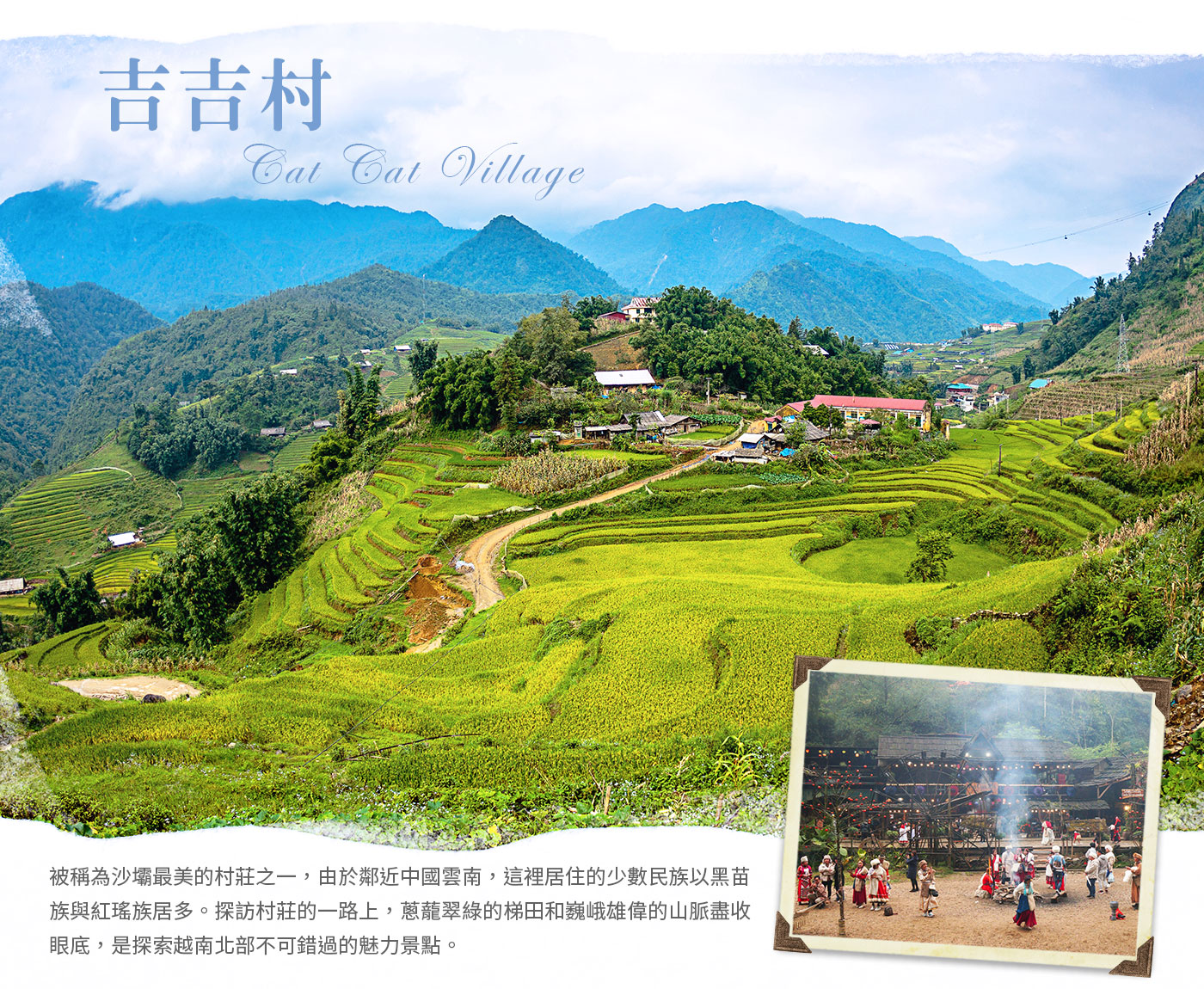被稱為沙壩最美的村莊之一,由於Sapa鄰近中國雲南,這裡居住的少數民族以黑苗族與紅瑤族居多。探訪村莊的一路上,蔥蘢翠綠的梯田和巍峨雄偉的山脈盡收眼底。遺世絕俗的少數民族部落在陽光普照、遠山含黛、環山繚繞的動人景色之下形成一副生動活潑、豐富多彩又有純淨美好的鄉村風光。這是探索越南北部山區之旅不可錯過的魅力無窮的旅遊景點。