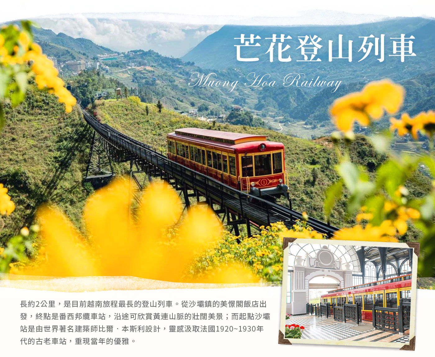連接沙壩鎮與潘西邦纜車站的芒華登山列車由太陽集團投資建設,長約2公里,是目前越南旅程最長的登山列車。從沙壩鎮的美憬閣(MGallery)飯店出發,終點是番西邦纜車站,沿途可欣賞黃連山脈的壯闊美景,而起點沙壩站是由世界著名建築師比爾•本斯利(BillBensley)設計,靈感汲取法國1920~1930年代的古老車站,重現當年的優雅。