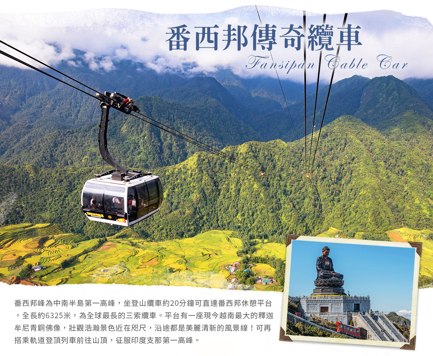 番西邦峰Fansipan海拔高3143米,距離沙壩約9公里,坐登山纜車約20分鐘可直達番西邦休憩平台,全長約6,325米,為全球最長的三索纜車。番西邦休憩平台有一座現今越南最大的釋迦牟尼青銅佛像、擁有多座工藝完美的佛像的金山寶勝寺、擁有18座2.5米高的銅製羅漢佛像的羅漢路、碧雲禪寺等,安排搭乘軌道登頂列車前往山頂,征服印度支那第一高峰,站在山頂上居高臨下的一瞬間,壯觀浩瀚的雲海近在咫尺,宛如人間仙境,讓自已沉浸在大自然和美麗景色之中,欣賞完壯闊的第一高峰美景後,慢慢地沿著風光環山步道拾階而下,沿途都是美麗清新的風景線。