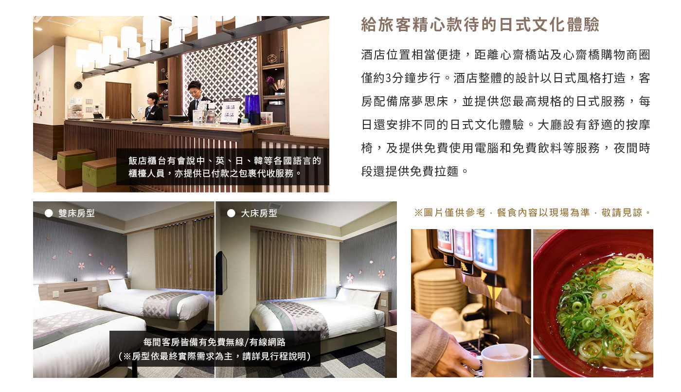 步行三分鐘即可抵達地鐵心齋橋站,無論是前往道頓堀、心齋橋商店街購物,或是感受大阪熱鬧夜景,都相當便利。飯店以「文化交流的橋樑」為理念,提供溫馨舒適的住宿環境。
