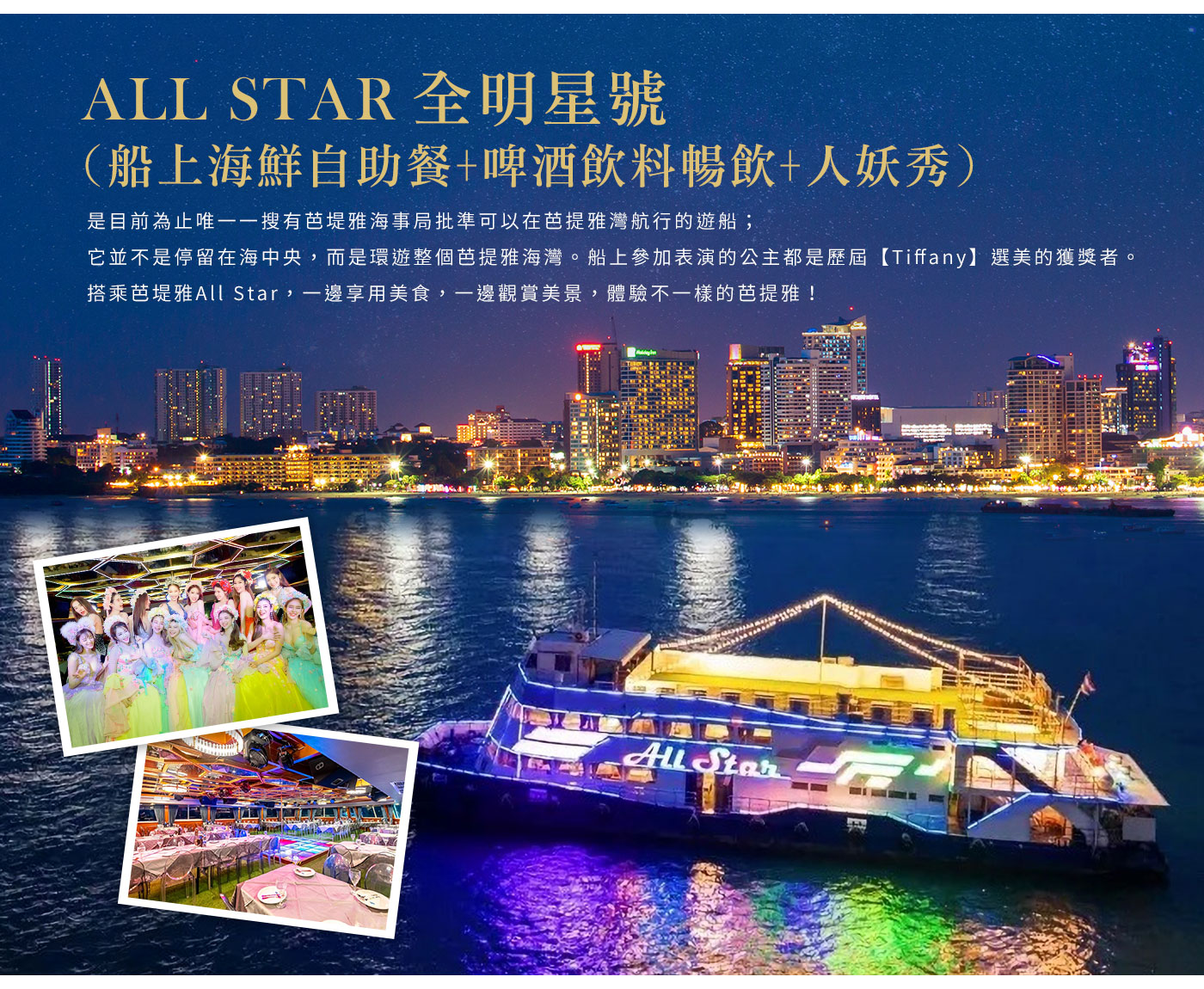 夜遊芭達雅灣:ALL STAR 全明星號 (海鮮自助晚餐+啤酒飲料暢飲+人妖表演)