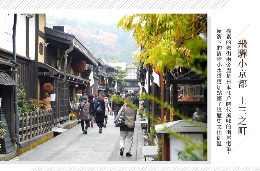 ●【上三之町,古之町並】從陣屋步行三分鐘即可抵達有「飛驒高山小京都」之美稱的【上三之町】,由數條街道組成「古之町並」,為高山代表散策名所,亦為國家選定重要傳統的建造物群保存區。這裡有古老的商店街、橋樑、傳統酒店等。在自然與歷史的保護下,每間店舖的外觀建築和內在陳設都保存著江戶時代以來的濃厚古早原味。屋齡大都在百年以上,是稀有珍貴的古建築物群。進入此街道中彷彿回到三百年前日本的時代中,並有當地之民俗產品,您可漫步在古街道上帶著懷古之情尋找飛驒之匠的手藝。