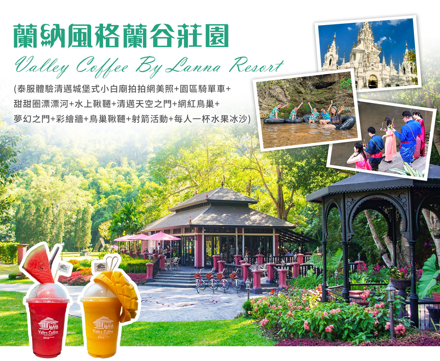 蘭納風格蘭谷莊園(泰服體驗清邁城堡式小白廟拍拍網美照+園區騎單車+甜甜圈漂漂河+水上鞦韆+清邁天空之門+網紅鳥巢+夢幻之門+彩繪牆+鳥巢鞦韆+射箭活動+每人一杯水果冰沙)